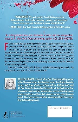 Beloved #1 New York Times bestselling author Colleen Hoover returns with an unforgettable love story between a writer and his unexpected muse. Fallon meets Ben, an aspiring novelist, the day before her scheduled cross-country move. Their untimely attraction leads them to spend Fallon?s last day in L.A. together, and her eventful life becomes the creative inspiration Ben has always sought for his novel. Over time and amidst the various relationships and tribulations of their own separate lives, they continue to meet on the same date every year. Until one day Fallon becomes unsure if Ben has been telling her the truth or fabricating a perfect reality for the sake of the ultimate plot twist. Can Ben?s relationship with Fallon?and simultaneously his novel?be consid-ered a love story if it ends in heartbreak?