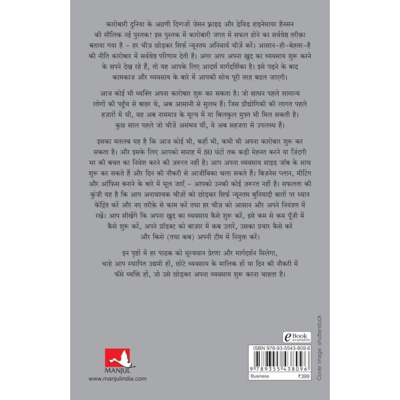 “ReWork: Change the Way You Work Forever” जेसन फ्रीड और डेविड हेन्सन के द्वारा लिखी गई एक अद्वितीय व्यापार पुस्तक है, जो कि सॉफ़्टवेयर कंपनी बेसकैम्प के संस्थापक हैं। यह पुस्तक काम के बारे में परंपरागत ज्ञान को छूने का प्रयास करती है और सफल व्यापार की दृष्टिकोण में एक ताजगी भरी परिप्रेक्ष्य प्रदान करती है। फ्रीड और हेन्सन का एक बिना-बक्सा और प्रतिसारी दृष्टिकोण होता है, जिसमें सारलता, लचीलापन, और वास्तविक रूप से महत्वपूर्ण बातों पर ध्यान केंद्रित है। उन्होंने पारंपरिक कॉर्पोरेट अभ्यासों पर सवाल उठाए हैं, काम के प्रति एक और प्रैक्टिकल, दक्ष, और मानव-केंद्रित दृष्टिकोण की प्रेरणा की है। “ReWork” में क्रियात्मक सलाह, वास्तविक जीवन के उदाहरण, और अनौपचारिक ज्ञान से भरा हुआ है जो पठकों को काम, उत्पादकता, और व्यापार सफलता के प्रति अपने दृष्टिकोण को पुनः विचार करने के लिए प्रेरित करता है। यह कुशल उद्यमियों, व्यापार नेताओं, और उन लोगों के लिए एक प्रेरणादायक पठन है जो काम करने के एक और प्रभावी तरीके में रुचि रखते हैं।